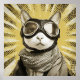 A fearless feline aviator gazes straight ahead through oversized leather goggles with shining chrome rims. A cozy plaid scarf wraps the neck while dramatic golden sunburst rays explode behind, studded with dark speckles like an old propeller-plane poster. Warm sepia fur tones contrast the bold retro halo, blending vintage adventure, quiet swagger, whimsical charm, and unmistakable cat coolness. Perfect for kids’ rooms, game dens, home offices, pet-lover walls, quirky bathrooms, or as playful gifts for cat people, aviation fans, retro enthusiasts, or anyone who loves humorous, stylish animal portraits with personality.