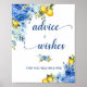 Os limões florais azuis e o sinal de mesa rosa da nossa coleção de temas Lemons é um complemento perfeito para o seu Chá de panela ou Festa de casamento. Conselhos e Desejos de 8" x 10" assinam um excelente adicional para os convidados deixarem comentários para a noiva ser ou ser casal recém-casado.