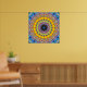 Arte de mandala azul-clara e amarela com formas caleidoscópicas redondas e padrões.
