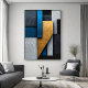Composição vertical abstrata com painéis geométricos sobrepostos. Tons de azul profundo, dourado envelhecido e cinza concreto com textura rachada. Design moderno e sofisticado ideal para decoração de interiores. Traga elegância industrial e profundidade visual para a sua parede com esta peça de arte exclusiva.
