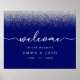 Este moderno sinal de boas-vindas do casamento apresenta falso brilho prateado com fontes brancas em um rico fundo azul real. Este sinal de boas-vindas é parte de um pacote de casamento que pode ser totalmente personalizado.