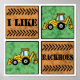 Quatro quadrados com um desenho animado e as palavras "Eu Gosto de Backhoes!"