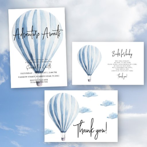 Convide amigos e família para compartilhar a alegria da chegada do seu pequeno com este chá de fraldas, com um balão de ar quente azul-aquarela. Itens correspondentes disponíveis.