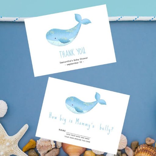 Um pequeno a caminho com este convite de chá de fraldas sob o tema do mar, apresentando baleia bebê em aquarelas moles azuis.