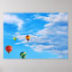 Uma fotografia vibrante capturando balões coloridos de ar quente flutuando graciosamente contra um céu azul brilhante cheio de nuvens fofinhas.