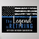 Este design apresenta uma bandeira da polícia com listras pretas e brancas, e uma fina faixa azul de linha também. O texto "A Legenda está se aposentando" fica acima do nome personalizável do polícia oficial aposentado, xerife, capitão ou chefe. Celebre este marco em estilo!