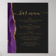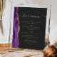 Um sinal elegante para o seu menu de bar de casamento. As palavras "menu bar" aparecem na caligrafia dourada com hastes no início e no fim, com texto personalizável abaixo. Uma aquarela púrpura agata design aparada com brilho dourado faux decora borda esquerda em um fundo preto ardente. Veja a nossa coleção para o convite de casamento e o diário de papelaria.