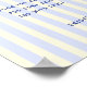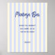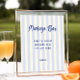 Sinal de bar de mimosa para chá de noiva com tema mediterrâneo caprichoso, apresentando uma paleta de cores suave e convidativa de creme e listras azuis suaves. Esse cenário tranquilo é perfeitamente complementado pela fonte manuscrita azul escura divertida, criando uma mistura harmoniosa de cores.
