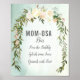 Sinal de mesa da Mãe-Oosa para os seus convidados para o chá de aspersão do bebê. spray floral de rosa branca elegante com fundo aquoso verde.