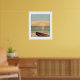 Poster de uma pintura de um belo pôr do sol sobre o oceano com o sol refletido nas ondulações da água. No chão há um barco à beira-mar na costa. Esperando que o dono volte para outra aventura no mar.