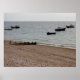 Vários barcos de pesca estão espalhados pelo mar calmo perto de uma praia de seixos sob um céu nublado. Um quebra-mar de madeira se projeta para dentro da água, marcando o limite da área da praia. Ancorados ao largo, os vários barcos estão dispostos em fileiras pela corrente e pelas ondas. Não são barcos a remo reais, mas fileiras de barcos tornados simétricos pela natureza.