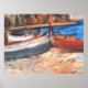Uma pintura de paisagens de velhos barcos rústicos na costa.