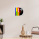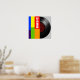 Metade de um registro de vinilo preto num cobrir colorido de grandes bandas verticais escritas MÚSICA