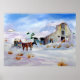 Pintura de celeiro. Esta poster é decorada com uma pintura aquosa de uma cena de inverno com cavalos e um técnico palco passando por um celeiro. Uma ideia de presente de excelente.