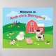 Um poster de boas-vindas para o tema do Barnyard. Este design unisex apresenta uma cena amigável de uma criança com um celeiro e personagens bonitos incluindo uma vaca, cordeiro, porco, galinha, galo e pintinhos.