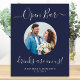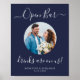 Bar Aberto ! Caligrafia simples e elegante, este letreiro de bar de casamento apresenta Barra aberta em caligrafia elegante e As bebidas são por nossa conta. Personalize este letreiro de casamento elegante com a sua foto de noivado ou foto de casal favorita, nomes e data! DIREITOS AUTORAIS © 2020 Judy Burrows, Black Dog Art - Todos os Direitos Reservados. Poster de Barra de Bebidas de Casamento Personalizada com Foto Azul-Marinho