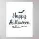 Um impressão de arte fofo e assustador do Dia das Bruxas com um simples design preto e branco que diz Feliz Halloween com um morcego negro. Perfeito para decoração para festas em outubro.