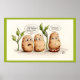 Engraçado Pun sobre Batatas. Um desenho de três batatas. A primeira pergunta: Por que somos chamados de batatas? Não temos dedos. O 3º tem pés grandes com dedos grandes e diz: Fale por vocês mesmos. borda de fundo do verde limão. Batatas marrons bonitas e divertidas penduradas no jardim. Design de desenho de desenhos animados. Desenho de Irony Design Donna Léger. Todos os Direitos Reservados.