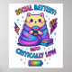 Design vibrante e colorido com um gato aconchegante embrulhado em um cobertor, sentado ao lado de uma pilha de livros tomando café. O texto colorido diz: "Bateria social criticamente baixa". Esse design está disponível em uma grande variedade de produtos.