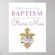 O é o perfeito poster de boas-vindas para o batismo, batizar ou comunhão das suas meninas. Adornada com uma cruz de brilho dourado e rosas roxas simples. Excelente a ser usado para receber convidados no evento, enquadrado ou colocado em uma parede.