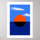 Um trabalho de arte de abstrato ousado inspirado em Bauhaus, com um nítido sol laranja e preto sobre a profundidade da água azul, com um céu azul brilhante e nuvens brancas suaves acima