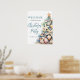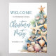 Welcome guests to your holiday gathering with this festive and beachy Christmas party welcome sign. The design features a large Christmas tree on the right made of beach shells, starfish, and coral, bringing a fun coastal touch to your celebration. The tree's soft green, tan, and coral-red details pair perfectly with the warm sandy base and teal blue water accents for a relaxed tropical vibe.