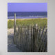 Uma imagem cênica de uma cerca de madeira nas dunas, olhando para a praia.