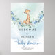 Design de sinal de porca de boas-vindas para Chá de fraldas de menino apresenta cor d'água pintada manualmente girafa de bebê bonitinha sentada sobre a nova coroa verde de eucalipto e flores azuis misturadas e poeirentas. Letra de script de desenho em mão moderna. Não hesite em contactar-me para obter itens ou personalizações correspondentes. Rosas de cor Bebê ©