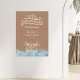 Um tema "baby on conselho" neutro com arte de linhagem branca com sol, ondas, ilha, palmeiras e pranchas. Texto branco. O fundo é areia terracota.