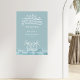 Um tema "baby on conselho" de chá de fraldas de menino que apresenta arte branca de linha com sol, ondas, ilha, palmeiras e pranchas de surfe. Texto branco. O fundo é azul.