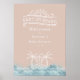 Um tema de "baby on conselho" chá de fraldas para meninas que apresenta arte de linhagem branca com sol, ondas, ilha, palmeiras e pranchas de surfe. Texto branco. O fundo é rosa.