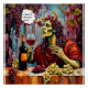 A figura mitológica de Baco, com cabelos de uva e chifres senta-se a uma mesa adornada com uvas segurando um copo de vinho, pensando que beberam muito álcool.