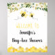 Bem-vindos aos convidados do seu partido com um sinal personalizado adorável. Enquadre o sinal e exiba-o numa mesa perto da entrada ou monte a espuma poster e mostre-a fora em um calcanhar. O design apresenta abelhas com florais de aquarelas e confete de folha de ouro falso com borda de mel.