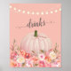 Aproveite este elegante, outono, chá de fraldas floral para uma menina. Pinks, corais e florais amarelos com fundo rosa pincelado e roteiro de "bebidas" sobre a abóbora. Luzes de cordas no topo e fita cor-de-rosa envoltas em tronco de abóbora.