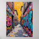 Esta pintura retrata um beco urbano estreito com paredes cobertas de grafite vibrante e texturado. A trabalho de arte tem um pesado impacto na textura, com pinceladas grossas e expressivas que dão ao grafite uma qualidade tátil elevada. O céu é um amarelo e laranja dramáticos, criando um forte contraste com os belos pinks, blues e púrpuros da arte de rua. O chão está cheio de pinturas coloridas, acrescentando ao sentimento dinâmico e enérgico da cena.