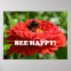 Mensagem bonita para "abelha feliz" com um abelha ocupada coletando pólen de uma flor vermelha brilhante.