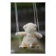 Een knuffel beer die op een schommel zit vanaf zijn rug gezien en in beweging is. Een speels beeld van een speelgoed beer in een speeltuin situatie. Geschikt voor kinderkamer of voor een dromerige sfeer waarin zachtheid en kinderlijke fantasie welkom is. Een zachte uitstraling in zomers plaatje dat illustratief dromerigheid weergeeft.