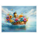 This delightful image, titled "Bee's Voyage," is a whimsical and cheerful children's illustration that radiates joy and adventure. It features a friendly bee with a captain's hat, steering a wooden boat overflowing with a vibrant assortment of flowers. The bee sails across a calm, glistening sea under a sunny sky, accompanied by a fluttering flag and a companion bee. The use of bright, joyful colors and the playful nature of the subject matter create an atmosphere of lighthearted exploration and wonder, perfect for inspiring stories and dreams in a child's imagination.