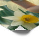 Uma bela fada de cabelos azuis com asas amarelas pálidas vestindo um vestido bonito de cor aqua e um colar aquamarino segura um solteiro de narciso enquanto está em um campo de narcisos.