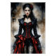 Uma jovem e espantosa mulher gótica com cantos de cabelo preto. Ela está vestindo Casacos compridas e vestidas negras e vermelhas Góticas Rave Longas. Mulheres Vestígias Vestidas Vestidas Vestidas Vestidas Vestidas Vestidas Vestidas Vestidas Vestidas Vestidas Vestígios.