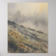 A dreamy watercolor painting capturing a distant gothic castle shrouded in thick morning fog. A winding path cuts through wild grasses and scattered red poppies in the foreground, while soft golden light pierces the mist from above. This atmospheric, mysterious landscape evokes fantasy, solitude, and enchantment—perfect for posters, canvas prints, and moody home decor.