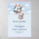 O design para poster de boas-vindas para o Chá de fraldas de menino apresenta cor d'água, pintados manualmente com ursos bonitos de bebê com balões azuis, marfim, bege e e castanhos descendo do céu azul, cheios de nuvens brancas e fofinhas - o que torna este conjunto adequado para um Chá de fraldas de menino. Letra de script de desenho em mão moderna. Não hesite em contactar-me para obter itens ou personalizações correspondentes. Rosas de cor Bebê ©