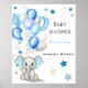 Uma bela arte de chá de fraldas com um elefante bebê com orelhas azuis segurando balões em cores azul, branca e prata. Design chá de fraldas adorável com estrelas azuis e creme à volta. Personalize alterando o texto e os detalhes.