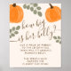 Um tema de queda adivinhando o tamanho do jogo de chá de fraldas de barriga de mamãe. Design apresenta uma fonte moderna de escrita caligráfica, abóboras laranja e ramos verdes de Eucalipto.