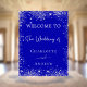 Um fundo azul real, decorado com falso brilho prateado, brilhos. Com o texto: Bem-vindo ao Casamento de... Personalize e adicione seus nomes.