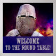 Vista aproximada de um capacete e de uma armadura de pratos de um cavaleiro medieval contra o fundo colorido que imita o espaço exterior ou um campo de batalha ao seu gosto. Texto - Bem-vindo à mesa redonda - adicionado