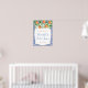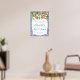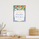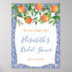 Laranjas em aquarela e lindas flores contra um fundo de padrão de azulejos azuis cobalto e branco para este elegante sinal de boas-vindas de Chuveiro de Noiva ou de Bebê.