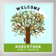Um sinal de boas-vindas de uma reunião de verão, com árvore genealógica cheia de aves de desenho animado. Editar texto para adicionar o nome da família.