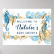 Sinal de Boas-Vindas de Chá de Bebê Azul e Dourado Sob o Mar (cartaz) com cavalos-marinhos, estrelas-do-mar, conchas e recifes de coral com caligrafia moderna. Para personalização avançada deste design, clique no botão "Personalizar" acima! Itens correspondentes também estão disponíveis.
