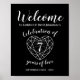 Bem-vindos convidados para a sua festa de aniversário de casamento de 7 com este moderno poster de arte de linha, disponível em vários tamanhos. A design apresenta tipografia branca no onyx black com as palavras Bem-vindo na letra da escrita e uma pedra angular da arte com as palavras bem-vindas celebrações de 7 anos de amor. Personalize com seus próprios nomes, aniversário e data de casamento embaixo. O Aniversário de Casamento de 7 está associado ao onyx preto de pedra gemônica e o coração simboliza o amor. Outros itens correspondentes disponíveis. Line art e design por www.mylittleeden.com no zazzle.